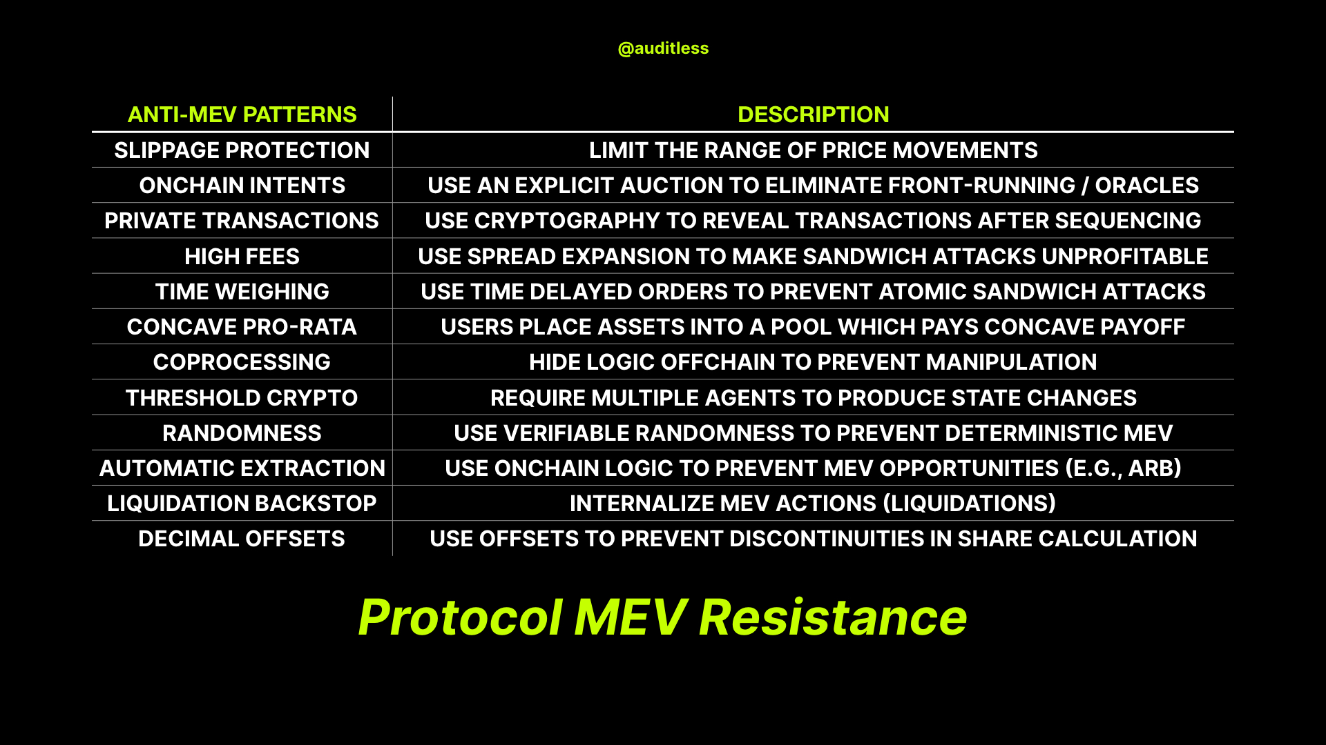 This includes slippage protection, auctions / onchain intents, high fees, time weighing, concave pro-rata games, automatic extraction, liquidation backstop, decimal offsets and co-processing.