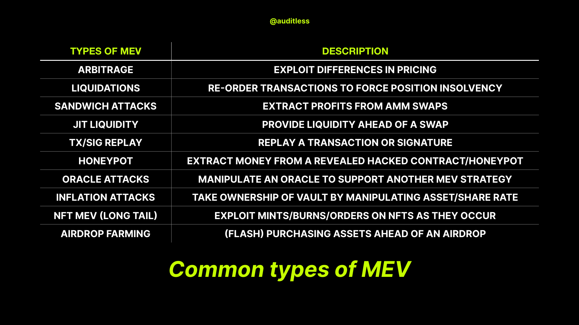 Instead this is best used as a catalog of ideas and perhaps more techniques can be discovered by deconstructing how MEV is applicable in the first place.