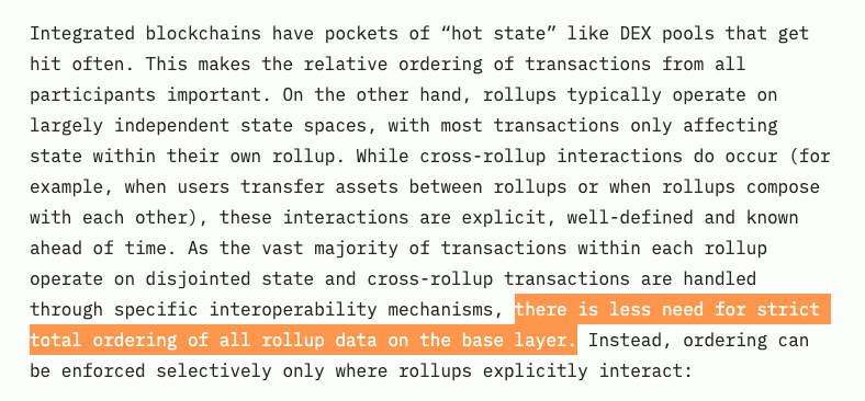 Namely, rollups need to rely on base layer consensus even for transactions that don't share state with other rollups.