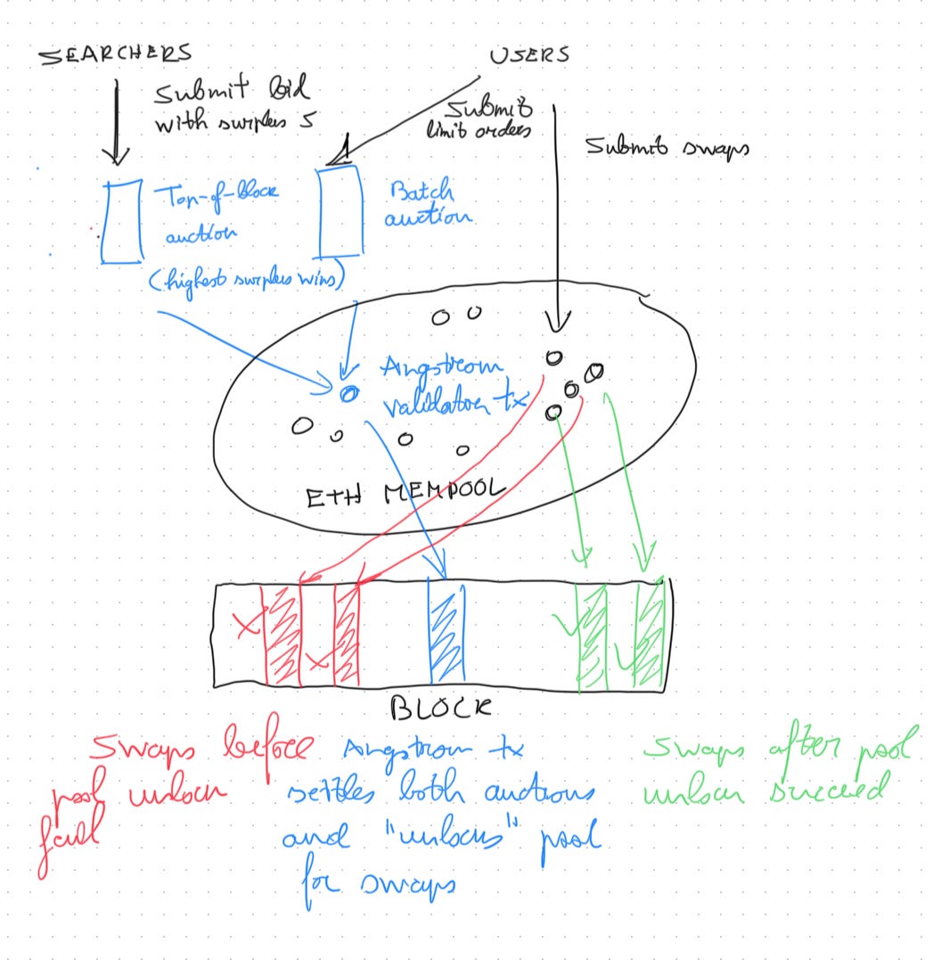 Angstrom changes the sequence of events by introducing two auctions. The first is an auction for the right to place a swap top-of-the-block and the second is a batch auction for limit orders: