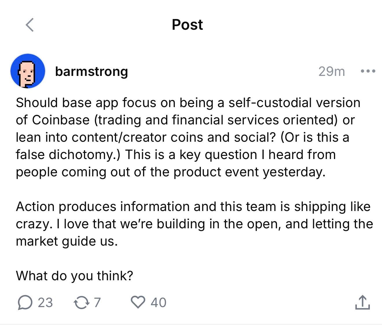They could have ignored Base App in favor of pushing Coinbase as the super app but instead they made Base App available to everyone and are trying to simultaneously build the best custodial and non-custodial experience out there;