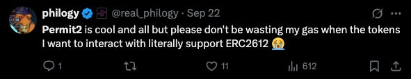 Ultimately Permit2 changed the game by allowing applications to decide which approval flow to use. Unfortunately, applications have failed to realize that ERC2612 should still be used when possible for tokens that support it.