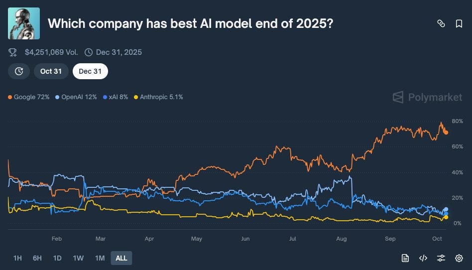 To make it concrete, there’s a live market that predicts that Google will have the model with the best Arena benchmark score (with 72% confidence) and it makes me wonder: who drives these markets and what information are they actually trading on (if any)?