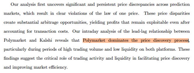 It’s therefore unsurprising that Polymarket dominates price discovery for other prediction markets as well.