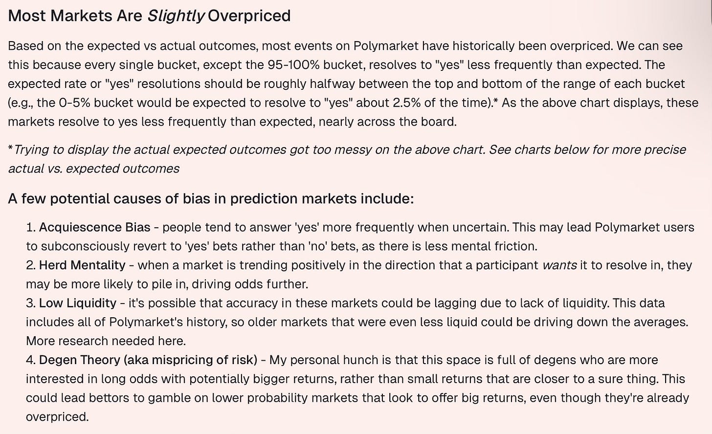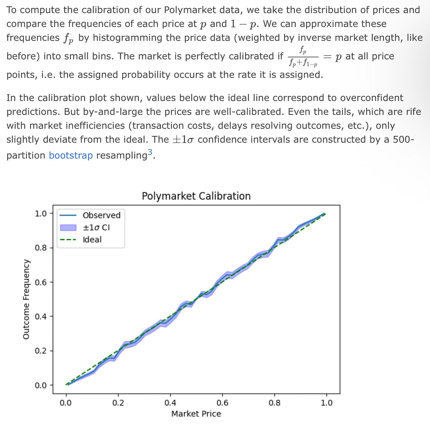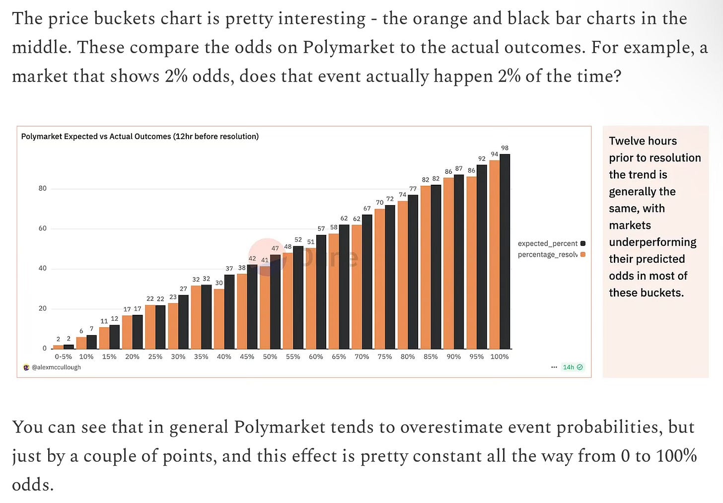 The first thing to note is that Polymarket does eventually converge to an accurate prediction. The >50% outcome is correct 94% of the time 4 hours before market resolution.