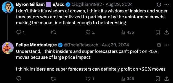 The interplay of these groups is what drives pricing on Polymarket. The low-information traders provide the profit incentive and the arbitrageurs, insiders and superforecasters reap it.