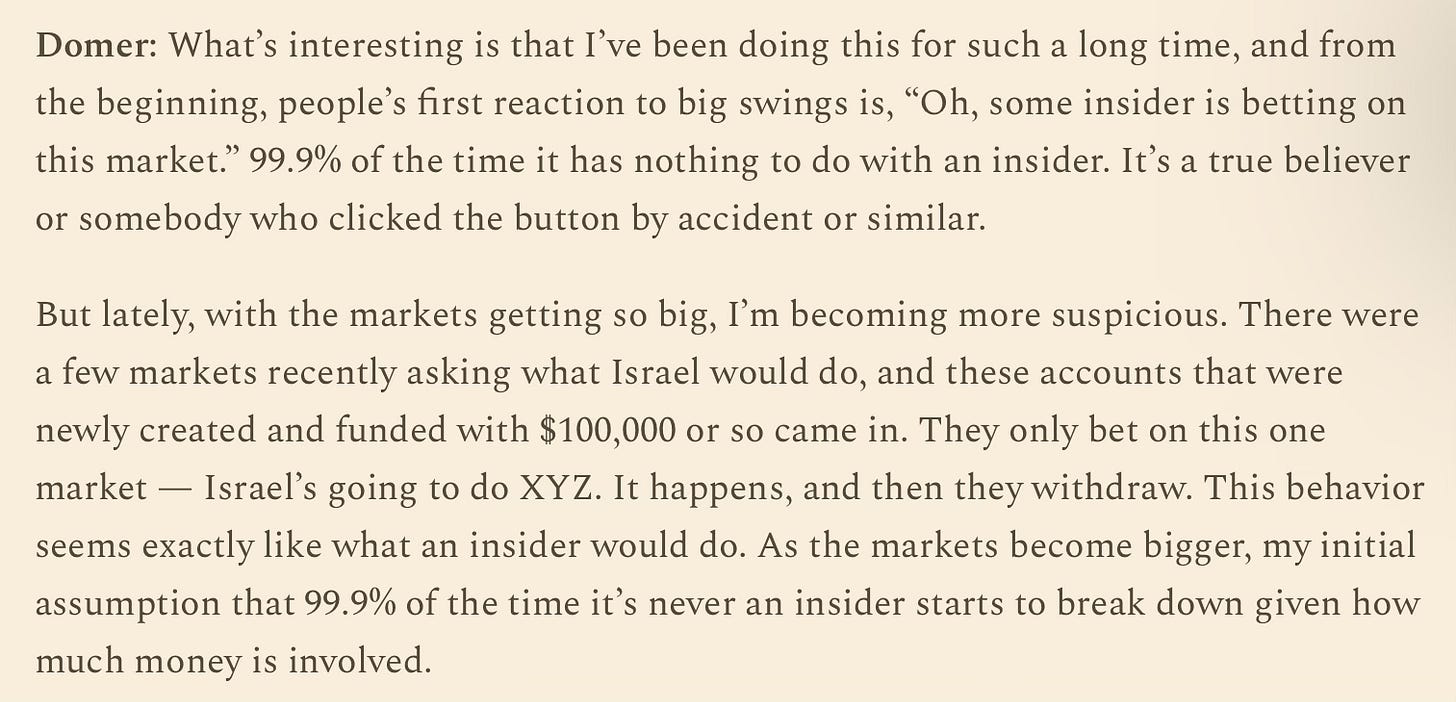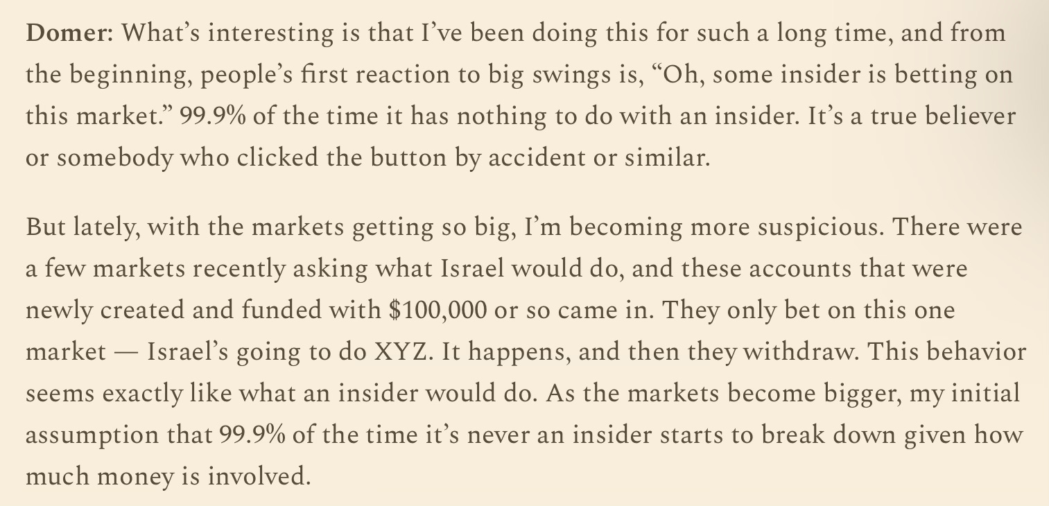 Insider trading is much harder to pin down and technically illegal according to the Terms of Service of all prediction market platforms. However, there are some indications that insider trading may be occurring in higher liquidity markets: