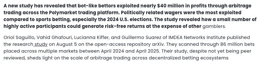 Just like in regular markets, arbitrageurs exploit low-latency and low-risk opportunities created by price discrepancies (e.g., Polymarket vs. Kalshi) or market irrationality (e.g., MECE outcomes don't add up to 100%).