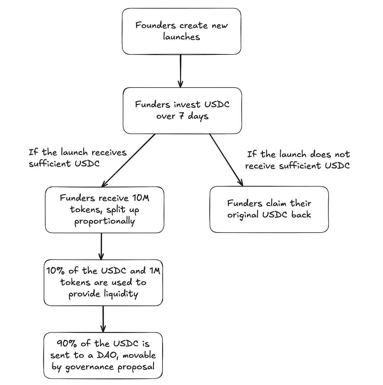 If a sufficient amount of USDC is met (Kickstarter model), the token is launched and funders receive a supply 10M proportionately divided;