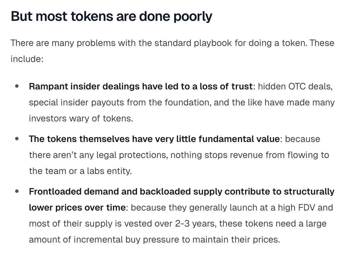 Launchpads radically simplified the launch process by providing issuance primitives (built-in market making), smart contracts and a distribution platform to reach users. This helped projects go from non-existent to a real market cap faster than ever. Unfortunately, this worked better for memecoins than for real utility projects. Launchpads still had hostile parametrisations which could be abused to rug users and there was no enforcement that teams would actively try and create value in the long-term. It wasn't the right model for serious projects.