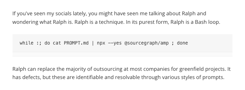 This piece will talk about “Ralphing” (an effective way of using coding agents) and the impact it may have on software development.