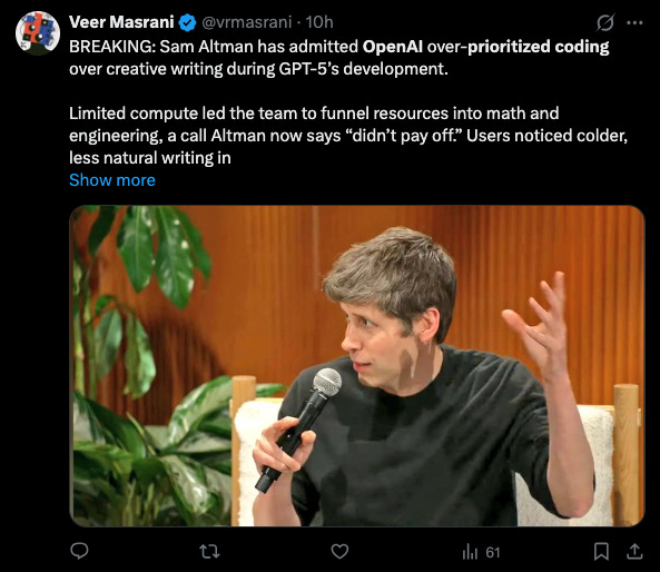 If you've wondered why agents can now one shot entire applications but can't help me find recipes without some heavy prompt engineering, it makes sense. Math & coding have been prioritized in model training instead.