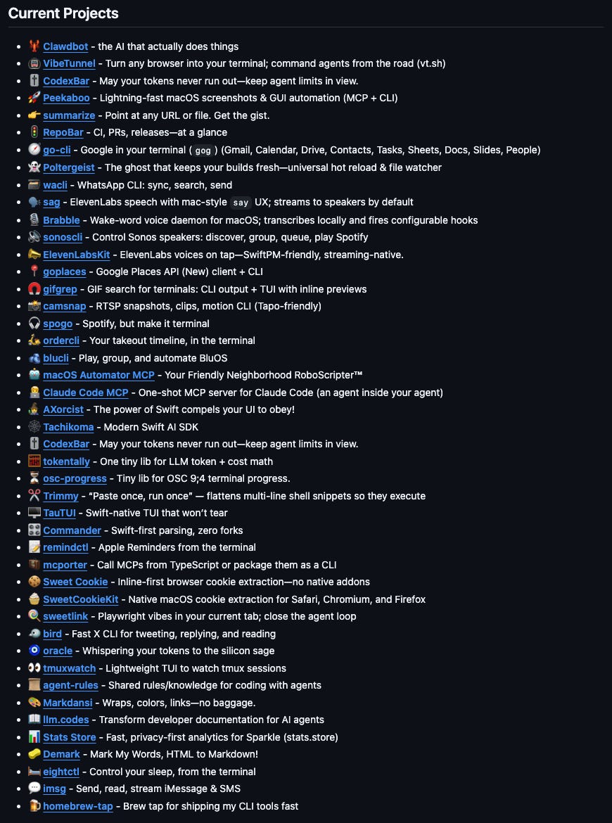 His "CURRENT PROJECTS” list nearly exceeds my vertical screen real estate but of course it’s the little lobster on top that has been stealing the show: Clawdbot Moltbot.