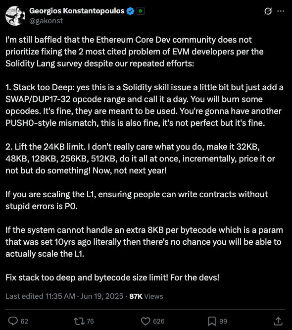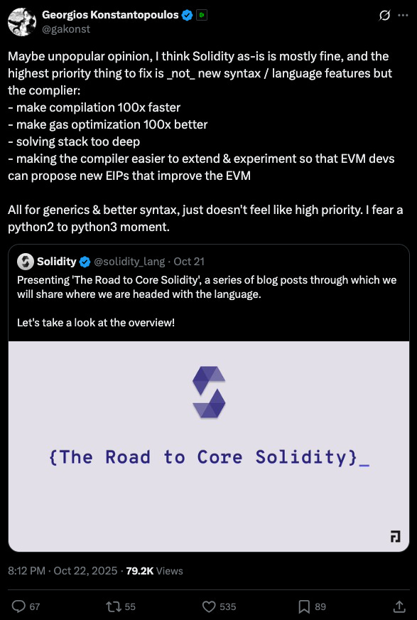 Solidity is not a language that gets to be opinionated in an effort to appeal to a specific subset of developers. It’s literally *the* platform language of Ethereum, its L2s and by extension all the parasitic Real World Asset chains that will be independent L1s but claim to be “Ethereum-compatible”.