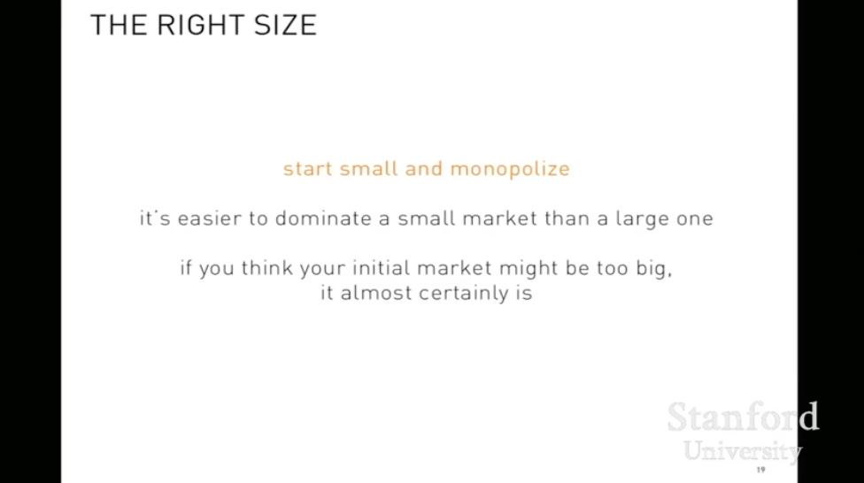 One of his core ideas was that there is a “right size” for a market you want to build your startup in. You want a small market so that you can dominate it and then maintain your monopoly as the market expands.