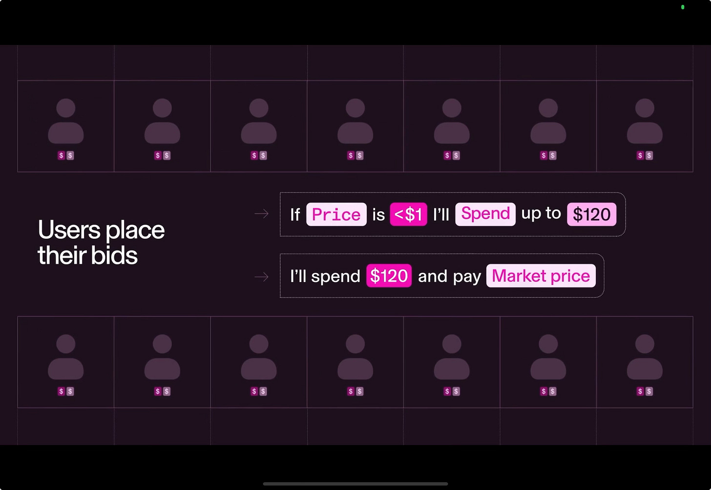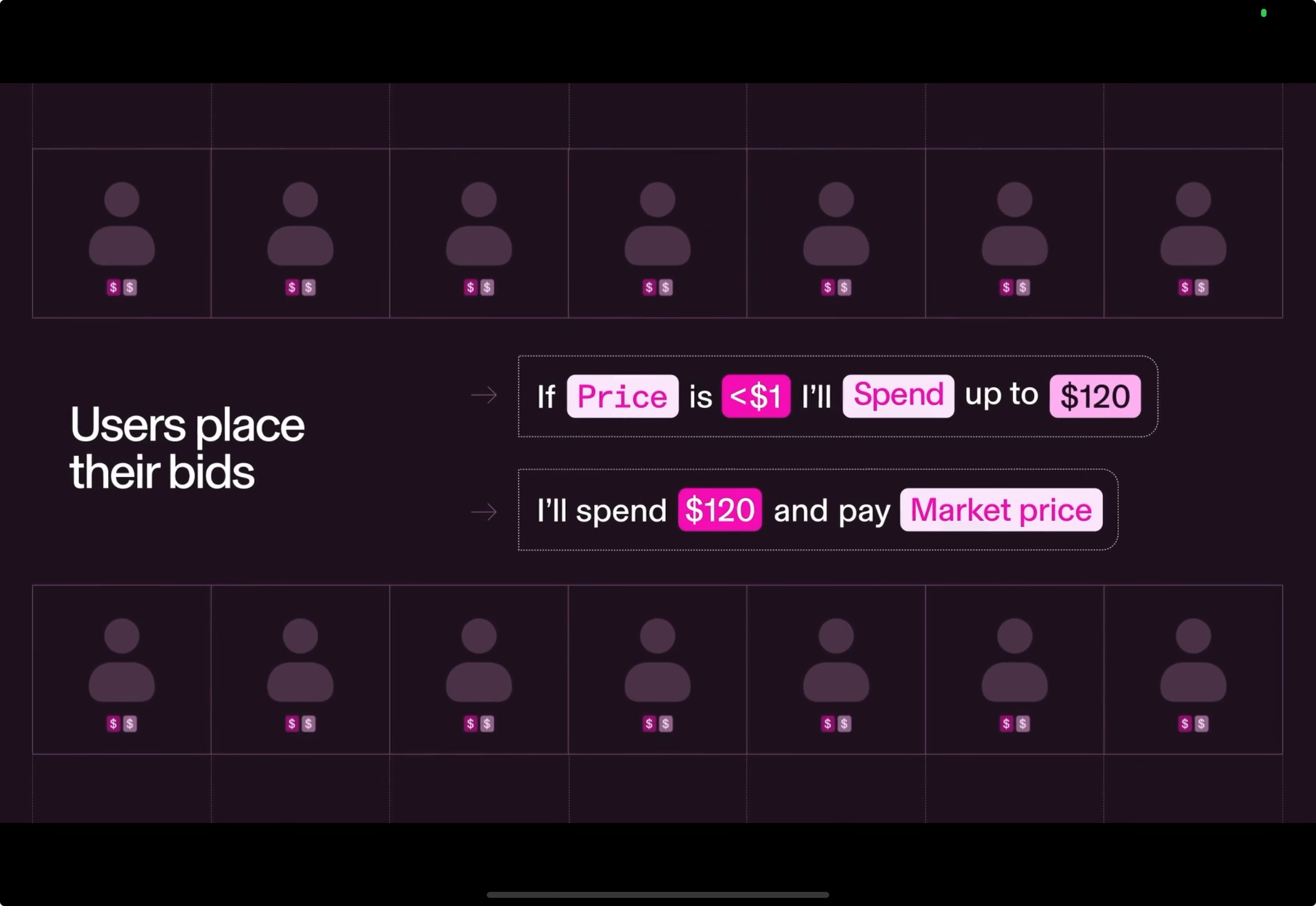 The key idea of the auction system is that each bid is spread out over the whole time horizon of the auction. Here’s how things work step-by-step.