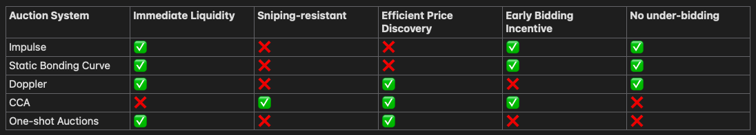 Finally, something Tarun suggested is that attention is an important byproduct of liquidity bootstrapping and in some ways while CCA aims to create as little trading activity as possible, that can be undesirable for discovery especially for “Veblen” goods. From the Doppler whitepaper: