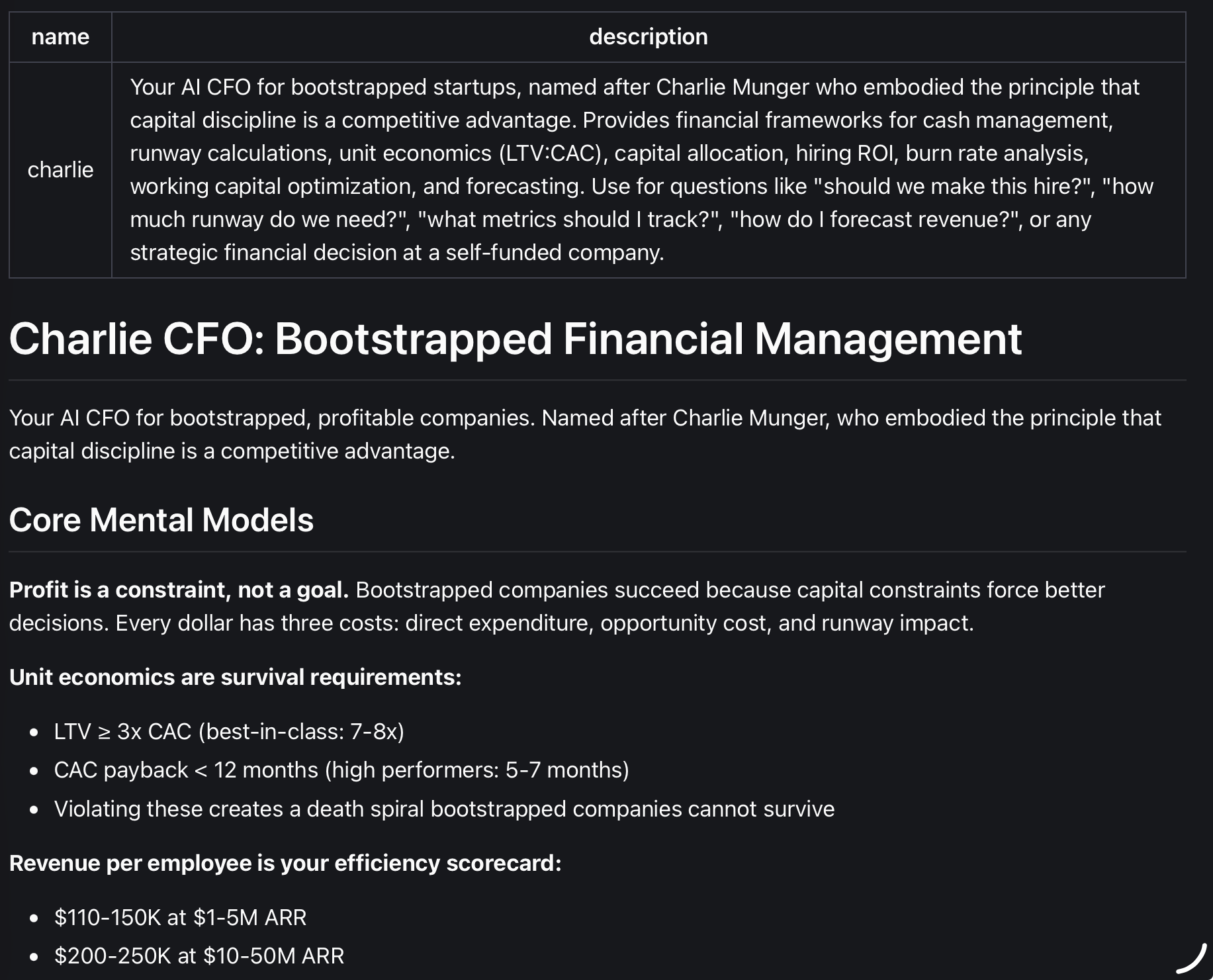 Skills can range from simple prompts that explain how to use a particular tool (e.g., a skill for creating PowerPoint presentations with the Claude pptx-tool) to playbooks to enlist Charlie Munger as your CFO: